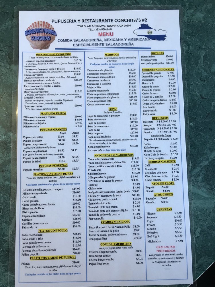 Introducing Conchita's # 2, a delightful Salvadoran gem located at 7501 Atlantic Ave, Cudahy, CA. This vibrant eatery has garnered a loyal following for its authentic flavor and rich cultural offerings. The star of the menu is undoubtedly the pupusas, praised by customers for their generous fillings and perfectly balanced masa. Jenny G. emphasizes the consistent quality, while Alfonso V. hails them as the best in Southern California.
